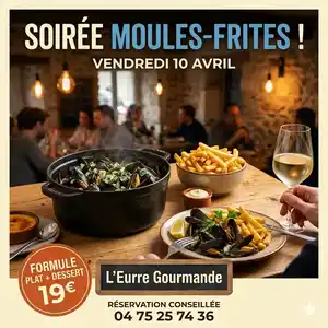 Suite au succĂšs de nos prĂ©cĂ©dentes soirĂ©es, l'Ă©quipe de L'Eurre Gourmande vous donne rendez-vous le vendredi 10 avril pour une nouvelle SoirĂ©e Moules-Frites ! đđ